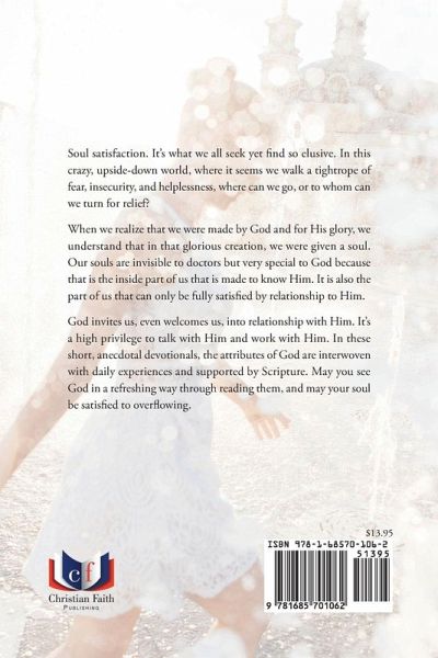Soul satisfaction. It's what we all seek yet find so elusive. In this crazy, upside-down world, where it seems we walk a tightrope of fear, insecurity, and helplessness, where can we go, or to whom can we turn for relief? When we realize that we were made by God and for His glory, we understand that in that glorious creation, we were given a soul. Our souls are invisible to doctors but very special to God because that is the inside part of us that is made to know Him. It is also the part of us that can only be fully satisfied by relationship to Him. God invites us, even welcomes us, into relationship with Him. It's a high privilege to talk with Him and work with Him. In these short, anecdotal devotionals, the attributes of God are interwoven with daily experiences and supported by Scripture. May you see God in a refreshing way through reading them, and may your soul be satisfied to overflowing.