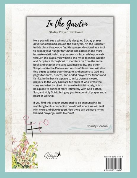 Here you will see a whimsically designed 31-day prayer devotional themed around the old hymn, "In the Garden." In this place I hope you find this prayer devtional as a tool to propel your hunger for Christ into a deeper and more intimate relationship as you seek His face. While you walk through the pages, you will find the lyrics to In the Garden and Scripture throughout to meditate on from the same book and chapter the song was inspired by, and other Scripture like the Psalms and words of Jesus. You will also find pages to write your thoughts and prayers to God and pages for notes, quotes, and added prayers for friends and family. In the back is a place to write down answered prayers. In the very back are fun facts of who wrote the song and what inspired him to write it! Ultimately, it is to be a place to connect more intimately with God-Father, Son, and Holy Spirit, bringing you to a point of prayer and a heart of worship. If you find this prayer devotional to be encouraging, be watching for its companion devotional where we will seek Him more and dive deeper! Also there will be more hymn themed prayer journals to come!