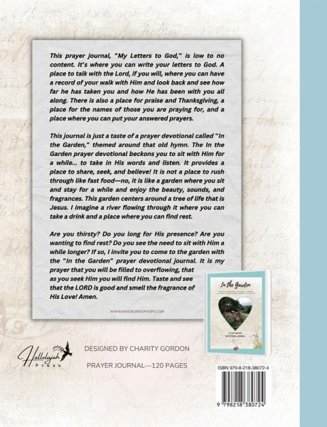 This prayer journal, "My Letters to God," is low to no content. It's where you can write your letters to God. A place to talk with the Lord, if you will, where you can have a record of your walk with Him and look back and see how far he has taken you and how He has been with you all along. There is also a place for praise and Thanksgiving, a place for the names of those you are praying for, and a place where you can put your answered prayers. This journal is just a taste of a prayer devotional called "In the Garden," themed around that old hymn. The In the Garden prayer devotional beckons you to sit with Him for a while... to take in His words and listen. It provides a place to share, seek, and believe! It is not a place to rush through like fast food-no, it is like a garden where you sit and stay for a while and enjoy the beauty, sounds, and fragrances. This garden centers around a tree of life that is Jesus. I imagine a river flowing through it where you can take a drink and a place where you can find rest. Are you thirsty? Do you long for His presence? Are you wanting to find rest? Do you see the need to sit with Him a while longer? If so, I invite you to come to the garden with the "In the Garden" prayer devotional journal. It is my prayer that you will be filled to overflowing, that as you seek Him you will find Him. Taste and see that the LORD is good and smell the fragrance of His Love! Amen.
