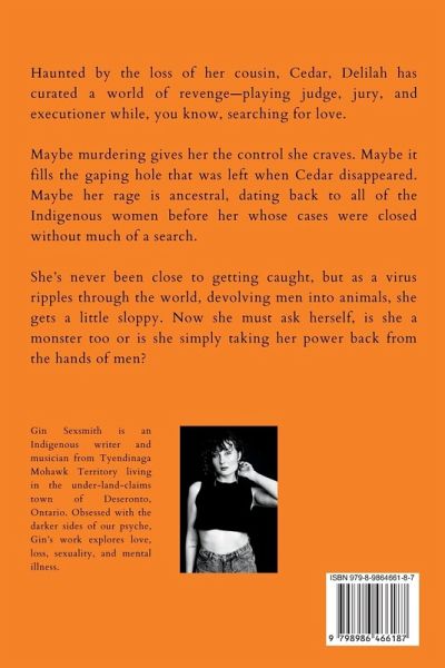 Haunted by the loss of her cousin, Cedar, Delilah has curated a world of revenge-playing judge, jury, and executioner while, you know, searching for love. Maybe murdering gives her the control she craves. Maybe it fills the gaping hole that was left when Cedar disappeared. Maybe her rage is ancestral, dating back to all of the Indigenous women before her whose cases were closed without much of a search. She's never been close to getting caught, but as a virus ripples through the world, devolving men into animals, she gets a little sloppy. Now she must ask herself, is she a monster too or is she simply taking her power back from the hands of men? Now she must ask herself, is she a monster too or is she simply taking her power back from the hands of men?