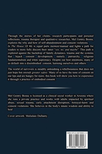 Through the stories of her clients, research participants and personal reflections, trauma therapist and qualitative researcher, Mel Gentry Bosna, explores the why and how of self-abandonment and consent violations. In The House Of Me is equal parts memoir and manual, and lights a path for readers to more fully discern their inner "yes, no, and maybe". This path is explored against the backdrop of family dynamics, trauma and the systems that hijack consent development, namely patriarchy, religious fundamentalism and white supremacy. Despite our best intentions, many of us default into a disembodied consent, harming ourselves and others. The world of survivors is steadily unleashing a rebelliousness that does not just hope but intends greater safety. Many of us have the taste of consent on our lips and are hungry for more, this book will show you how to experience it through a practice of embodied consent.