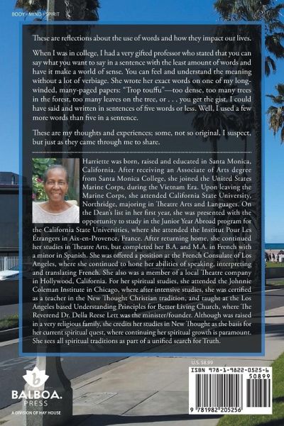 These are reflections about the use of words and how they impact our lives. When I was in college, I had a very gifted professor who stated that you can say what you want to say in a sentence with the least amount of words and have it make a world of sense. You can feel and understand the meaning without a lot of verbiage. She wrote her exact words on one of my long-winded, many-paged papers: Trop touffutoo dense, too many trees in the forest, too many leaves on the tree, or . . . you get the gist. I could have said and written in sentences of five words or less. Well, I used a few more words than five in a sentence. These are my thoughts and experiences; some, not so original, I suspect, but just as they came through me to share.
