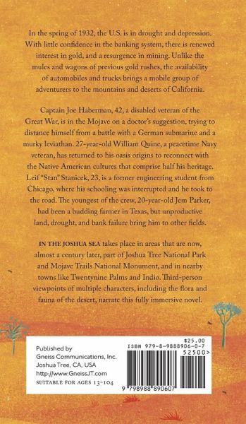 In the spring of 1932, the U.S. is in drought and depression. With little confidence in the banking system, there is renewed interest in gold, and a resurgence in mining. Unlike the mules and wagons of previous gold rushes, the availability of automobiles and trucks brings a mobile group of adventurers to the mountains and deserts of California. Captain Joe Haberman, 42, a disabled veteran of the Great War, is in the Mojave on a doctor's suggestion, trying to distance himself from a battle with a German submarine and a murky leviathan. 27-year-old William Quine, a peacetime Navy veteran, has returned to his oasis origins to reconnect with the Native American cultures that comprise half his heritage. Leif "Stan" Stanicek, 23, was an engineering student in Chicago when his schooling was interrupted and he took to the road. The youngest of the crew, 20-year-old Jem Parker, had been a budding farmer in Texas, but unproductive land, drought, and bank failure bring him to other fields. IN THE JOSHUA SEA takes place in areas that are now, almost a century later, part of Joshua Tree National Park and Mojave Trails National Monument, and in nearby towns like Twentynine Palms and Indio. Third-person viewpoints of multiple characters, including the flora and fauna of the desert, narrate this fully immersive novel.