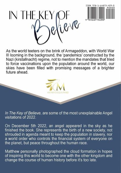 As the world teeters on the brink of Armageddon, with World War III looming in the background, the 'pandemics' constructed by the Nazi (kirstallnacht) regime, not to mention the mandates that tried to force vaccinations upon the population around the world, our skies have been filled with promising messages of a brighter future ahead. In The Key of Believe, are some of the most unexplainable Angel visitations of 2022. On December 5th 2022, an angel appeared in the sky as he finished the book. She represents the birth of a new society, not shrouded in agenda meant to keep the population in slavery, nor a world order who controls the financial system of everyone on the planet, but peace throughout the human race. Matthew personally photographed the cloud formation in hopes of inspiring this world to become one with the other kingdom and change the course of human history before it's too late.