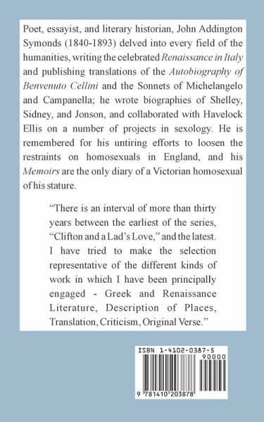 Poet, essayist, and literary historian, John Addington Symonds (1840-1893) delved into every field of the humanities, writing the celebrated Renaissance in Italy and publishing translations of the Autobiography of Benvenuto Cellini and the Sonnets of Michelangelo and Campanella; he wrote biographies of Shelley, Sidney, and Jonson, and collaborated with Havelock Ellis on a number of projects in sexology. He is remembered for his untiring efforts to loosen the restraints on homosexuals in England, and his Memoirs are the only diary of a Victorian homosexual of his stature. "There is an interval of more than thirty years between the earliest of the series, "Clifton and a Lad's Love," and the latest. I have tried to make the selection representative of the different kinds of work in which I have been principally engaged - Greek and Renaissance Literature, Description of Places, Translation, Criticism, Original Verse."