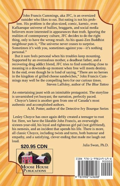 John Francis Cummings (JFC) is big, but his size is not his problem. It's the bullying that it seems to attract. With tensions at home and stress at school, he draws on the support of a neighbour, his one friend, and a drop-in centre for strength to always do the right thing. Which does not always turn out well.