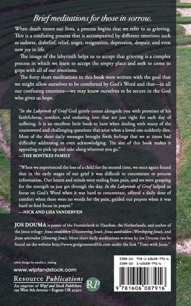 In the Labyrinth of Grief 40 Words of God that Offer Comfort Brief meditations for those in sorrow When death enters our life, a process begins that we refer to as grieving. This is a confusing process that is accompanied by different emotions such as sadness, unbelief, relief, anger, resignation, depression, despair, and even new joy in life. The image of the labyrinth helps us to accept that grieving is a complex process in which we learn to accept the empty place and seek to come to grips with all our emotions. The forty short meditations in this book were written with the goal that we might allow ourselves to be comforted from God's Word and that-in all our confusing emotions-we may know ourselves to be secure in the God who gives us hope.