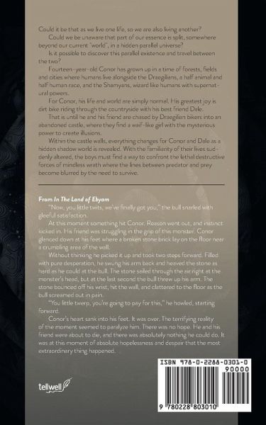 Could it be that as we live one life, so we are also living another? Could we be unaware that part of our essence is split, somewhere beyond our current "world", in a hidden parallel universe? Is it possible to discover this parallel existence and travel between the two? Fourteen-year-old Conor has grown up in a time of forests, fields and cities where humans live alongside the Draegilians, a half animal and half human race, and the Shamyans, wizard-like humans with supernatural powers. For Conor, his life and world are simply normal. His greatest joy is dirt bike riding through the countryside with his best friend Dale. That is until he and his friend are chased by Draegilian bikers into an abandoned castle, where they find a waif-like girl with the mysterious power to create illusions. Within the castle walls, everything changes for Conor and Dale as a hidden shadow world is revealed. With the familiarity of their lives suddenly altered, the boys must find a way to confront the lethal destructive forces of mindless wrath where the lines between predator and prey become blurred by the need to survive.