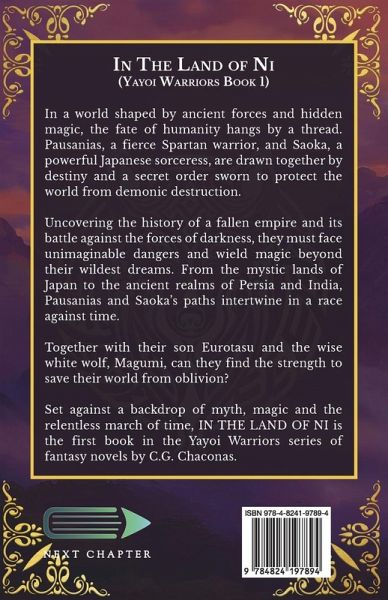 In a world shaped by ancient forces and hidden magic, the fate of humanity hangs by a thread. Pausanias, a fierce Spartan warrior, and Saoka, a powerful Japanese sorceress, are drawn together by destiny and a secret order sworn to protect the world from demonic destruction. Uncovering the history of a fallen empire and its battle against the forces of darkness, they must face unimaginable dangers and wield magic beyond their wildest dreams. From the mystic lands of Japan to the ancient realms of Persia and India, Pausanias and Saoka's paths intertwine in a race against time. Together with their son Eurotasu and the wise white wolf, Magumi, can they find the strength to save their world from oblivion? Set against a backdrop of myth, magic and the relentless march of time, IN THE LAND OF NI is the first book in the Yayoi Warriors series of fantasy novels by C.G. Chaconas.