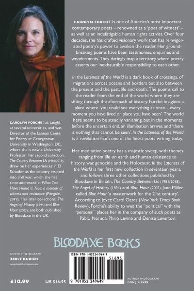 Carolyn Forche is one of America's most important contemporary poets. Her later collections are visionary works drawing on work written over many years. In the Lateness of the World is a dark book of crossings, of migrations across oceans and borders but also between the present and the past, life and death.