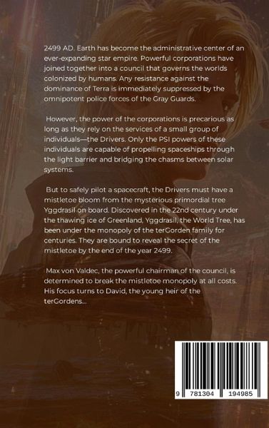 AD 2499. Earth has become the administrative center of an ever-expanding star empire. Powerful corporations have joined together into a council that governs the worlds colonized by humans. Any resistance against the dominance of Terra is immediately suppressed by the omnipotent police forces of the Gray Guards. However, the power of the corporations is precarious as long as they rely on the services of a small group of individuals-the Drivers. Only the PSI powers of these individuals are capable of propelling spaceships through the light barrier and bridging the chasms between solar systems. But to safely pilot a spacecraft, the Drivers must have a mistletoe bloom from the mysterious primordial tree Yggdrasil on board. Discovered in the 22nd century under the thawing ice of Greenland, Yggdrasil, the World Tree, has been under the monopoly of the terGorden family for centuries. They are bound to reveal the secret of the mistletoe by the end of the year 2499. Max von Valdec, the powerful chairman of the council, is determined to break the mistletoe monopoly at all costs. His focus turns to David, the young heir of the terGordens...