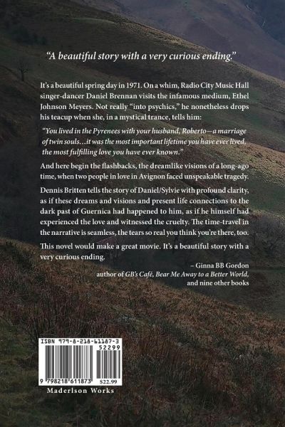 It's a beautiful spring day in 1970. On a whim, Radio City Music Hall singer-dancer Daniel Brennan visits the infamous medium, Ethel Johnson Meyers. Not really "into psychics," he nonetheless drops his teacup when she, in a mystical trance, tells him: "You lived in the Pyrenees with your husband, Roberto-a marriage of twin souls...it was the most important lifetime you have ever lived, the most fulfilling love you have ever known." And here begin the flashbacks, the dreamlike visions of a long-ago time, when two people in love in Avignon faced unspeakable tragedy. Dennis Britten tells the story of Daniel/Sylvie with profound clarity, as if these dreams and visions and present life connections to the dark past of Guernica had happened to him, as if he himself had experienced the love and witnessed the cruelty. The time-travel in the narrative is seamless, the tears so real you think you're there, too. It's a beautiful story with a very curious ending.