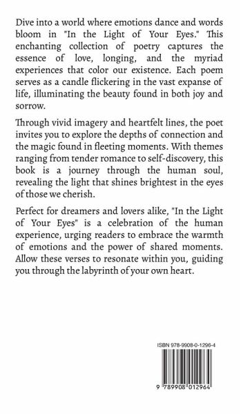 Dive into a world where emotions dance and words bloom in "In the Light of Your Eyes." This enchanting collection of poetry captures the essence of love, longing, and the myriad experiences that color our existence. Each poem serves as a candle flickering in the vast expanse of life, illuminating the beauty found in both joy and sorrow. Through vivid imagery and heartfelt lines, the poet invites you to explore the depths of connection and the magic found in fleeting moments. With themes ranging from tender romance to self-discovery, this book is a journey through the human soul, revealing the light that shines brightest in the eyes of those we cherish. Perfect for dreamers and lovers alike, "In the Light of Your Eyes" is a celebration of the human experience, urging readers to embrace the warmth of emotions and the power of shared moments. Allow these verses to resonate within you, guiding you through the labyrinth of your own heart.