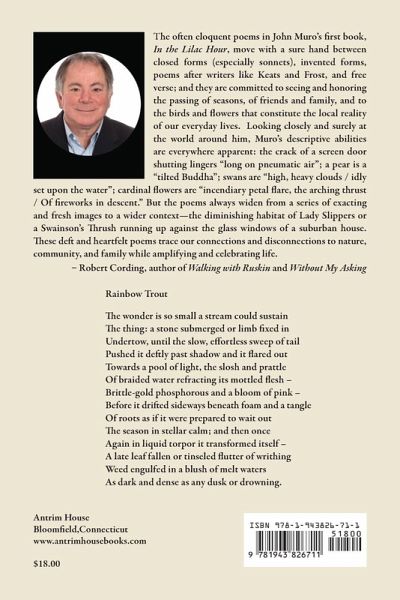 The poems in John Muro's first book, In the Lilac Hour & Other Poems, move with a sure hand between closed forms (especially sonnets), invented forms, poems after writers like Keats and Frost, and free verse; and they are committed to seeing and honoring the passing of seasons, of friends and family, and to the birds and flowers that constitute the local reality of our everyday lives. Looking closely and surely at the world around him, Muro's descriptive abilities are everywhere apparent: the crack of a screen door shutting lingers "long on pneumatic air"; a pear is a "tilted Buddha"; swans are "high, heavy clouds / idly set upon the water"; cardinal flowers are "incendiary petal flare, the arching thrust / Of fireworks in descent." But the poems always widen from a series of exacting and fresh images to a wider context-the diminishing habitat of Lady Slippers or a Swainson's Thrush running up against the glass windows of a suburban house. These deft and heartfelt poems trace our connections and disconnections to nature, community, and family while amplifying and celebrating life.