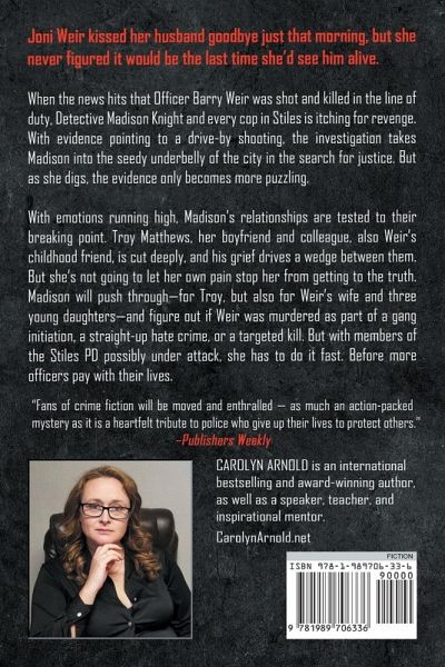 "A roller-coaster ride of a plot with all manner of twists and turns." -Midwest Book Review Joni Weir kissed her husband goodbye just that morning, but she never figured it would be the last time she'd see him alive. When the news hits that Officer Barry Weir was shot and killed in the line of duty, Detective Madison Knight and every cop in Stiles is itching for revenge. With evidence pointing to a drive-by shooting, the investigation takes Madison into the seedy underbelly of the city in the search for justice. But as she digs, the evidence only becomes more puzzling. With emotions running high, Madison's relationships are tested to their breaking point. Troy Matthews, her boyfriend and colleague, also Weir's childhood friend, is cut deeply, and his grief drives a wedge between them. But she's not going to let her own pain stop her from getting to the truth. Madison will push through-for Troy, but also for Weir's wife and three young daughters-and figure out if Weir was murdered as part of a gang initiation, a straight-up hate crime, or a targeted kill. But with members of the Stiles PD possibly under attack, she has to do it fast. Before more officers pay with their lives. A brilliant action-packed mystery with heart-stopping twists. Perfect for fans of Robert Dugoni, J.D. Robb, and Lisa Regan. Readers love In the Line of Duty: "Fans of crime fiction will be moved and enthralled by In the Line of Duty, as much an action-packed mystery as it is a heartfelt tribute to police who give up their lives to protect others." -Publishers Weekly "A hard-hitting, emotional novel." ¿¿¿¿¿ "A slew of twists and turns along the way." ¿¿¿¿¿ "Arnold...makes us feel a roller coaster of emotions." ¿¿¿¿¿ "I absolutely loved this book." ¿¿¿¿¿ "I actually could see it being a movie." ¿¿¿¿¿ "Arnold puts words and feelings in this book that are true to life. Great writer and series." ¿¿¿¿¿ "Brilliant as usual." ¿¿¿¿¿ "An insightful look into the lives and losses our country's heroes face every day on the front lines." ¿¿¿¿¿