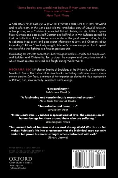 A Jew passing as a Christian in occupied Poland during WWII, Oswald Rufeisen worked as translator and personal secretary to a Nazi commander of the German police, repeatedly risking his life to save hundreds from the Nazis. A relatively unknown Jewish hero and rescuer at the magnitude of Oskar Schindler, Rufeisen's life and role during the Holocaust is perhaps even more riveting and complex than the man memorialized by Stephen Spielberg in Schindler's List. Only seventeen years old when WWII began, Rufeisen joined the exodus of Poles who fled the approaching German army. Bright and talented, Rufeisen used his ability to speak fluent German to pass as half German and half Polish in Mir, where he came to serve the German commander in charge of the gendarmerie. As he carried out his duties - reading death sentences to prisoners, swearing in new police officers before a portrait of Hitler - he earned the trust and affection of the German commander, yet lived in constant fear of discovery. He used his position to pass secret information to Jews and Christians about impending "Aktionen" and to sabotage Nazi plans. Most notably, he thwarted the annihilation of the Mir ghetto by arming hundreds of Jews and organizing their escape, and saved an entire Belorussian village from destruction. Eventually discovered and denounced, Rufeisen escaped and found shelter in a convent, where he converted to Catholicism. Though a pacifist, he spent the rest of the war fighting in a Russian partisan unit, similar to the Bielski unit of Tec's Defiance. After the war, Father Daniel (as he came to be known) became a priest and a Carmelite monk. Identifying himself as a Christian Jew and an ardent Zionist, he moved to Israel, where he challenged the Law of Return in a case that reached the High Court and attracted international attention. In the Lion's Den, from author Nechama Tec of Defiance and several other astonishing accounts of Jewish survival and rescue during the Holocaust, offers a stirring portrait of a Jewish rescuer during the Holocaust and its aftermath, illuminating the intricate connections between good and evil, cruelty and compassion, and Judaism and Christianity.