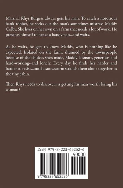 Marshal Rhys Burgess always gets his man. To catch a notorious bank robber, he seeks out the man's sometimes-mistress Maddy Colby. She lives on her own on a farm that needs a lot of work. He presents himself to her as a handyman...and waits. As he waits, he gets to know Maddy, who is nothing like he expected. Isolated on the farm, shunned by the townspeople because of the choices she's made, Maddy is smart, generous and hard-working--and lonely. Every day he finds her harder and harder to resist...until a snowstorm strands them alone together in the tiny cabin. Then Rhys needs to discover...is getting his man worth losing his woman?