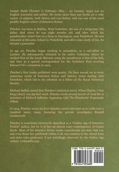 Joseph Smith Fletcher (7 February 1863 - 30 January 1935) was an English journalist and author. He wrote more than 230 books on a wide variety of subjects, both fiction and non-fiction, and was one of the most prolific English writers of detective fiction. Fletcher was born in Halifax, West Yorkshire, the son of a clergyman. His father died when he was eight months old, and after which his grandmother raised him on a farm in Darrington, near Pontefract. He was educated at Silcoates School in Wakefield, and after some study of law, he became a journalist. At age 20, Fletcher began working in journalism, as a sub-editor in London. He subsequently returned to his native Yorkshire, where he worked first on the Leeds Mercury using the pseudonym A Son of the Soil, and then as a special correspondent for the Yorkshire Post covering Edward VII's coronation in 1902. Fletcher's first books published were poetry. He then moved on to write numerous works of historical fiction and history, many dealing with Yorkshire, which led to his selection as a fellow of the Royal Historical Society. Michael Sadleir stated that Fletcher's historical novel, When Charles I Was King (1892), was his best work. Fletcher wrote several novels of rural life in imitation of Richard Jefferies, beginning with The Wonderful Wapentake (1894). In 1914, Fletcher wrote his first detective novel and went on to write over a hundred more, many featuring the private investigator Ronald Camberwell. Fletcher is sometimes incorrectly described as a "Golden Age of Detective Fiction" author, but he is in fact an almost exact contemporary of Conan Doyle. Most of his detective fiction works considerably pre-date that era, and even those few published within it do not conform to the closed form and strict rules professed, if not unfailingly observed, by the Golden Age writers. (wikipedia.org)