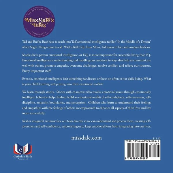 Ted and Bubba Bear have to reach into Ted's emotional intelligence toolkit "In the Middle of a Dream" when Night Things come to call. With a little help from Mom, Ted learns to face and conquer his fears. Studies have proven emotional intelligence, or EQ, is more important for successful living than IQ. Emotional intelligence is understanding and handling our emotions in ways that help us communicate well with others, promote empathy, overcome challenges, resolve conflict, and relieve our stressors. Pretty important stuff. Even so, emotional intelligence isn't something we discuss or focus on often in our daily living. What is your child learning and putting into their emotional toolkit? We learn through stories. Stories with characters who resolve emotional issues through emotionally intelligent behaviors help children build an emotional toolkit of self-confidence, self-awareness, self-discipline, empathy, boundaries, and perception. Children who learn to understand their feelings and empathize with the feelings of others are empowered to enhance all aspects of their lives and live more successfully. Real or imagined, we must face our fears directly so we can understand and process them, creating self-awareness and self-confidence, empowering us to keep emotional fears from integrating into our lives. missdale.com