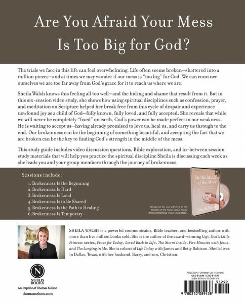 The trials we face in this life can feel overwhelming. Life often seems broken--shattered into a million pieces--and at times we may wonder if our mess is "too big" for God. We can convince ourselves we are too far away from God's grace for it to reach us where we are. Sheila Walsh knows this feeling all too well--and the hiding and shame that result from it. But in this six-session video study, she shows how using spiritual disciplines such as confession, prayer, and meditation on Scripture helped her break free from this cycle of despair and experience newfound joy as a child of God--fully known, fully loved, and fully accepted. She reveals that while we will never be completely "fixed" on earth, God's power can be made perfect in our weakness. He is waiting to accept us--having already promised to love us, heal us, and carry us through to the end. Our brokenness can be the beginning of something beautiful, and accepting the fact that we are broken can be the key to finding God's strength in the middle of the mess. This study guide includes video discussion questions, Bible exploration, and in-between session study materials that will help you practice the spiritual discipline Sheila is discussing each week as she leads you and your group members through the journey of brokenness. Sessions include: 1. Brokenness Is the Beginning 2. Brokenness Is Hard 3. Brokenness Is Loud 4. Brokenness Is to Be Shared 5. Brokenness Is the Path to Healing 6. Brokenness Is Temporary Designed for use with the In the Middle of the Mess Video Study (sold separately).