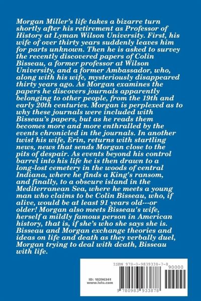 Morgan Miller's life takes a bizarre turn after his retirement as Prof. of History at Wilson Univ. First, his wife leaves him, then he is asked to survey the recently discovered papers of Colin Bisseau, formerly of Wilson Univ., who mysteriously disappeared 30 years ago. As Morgan examines the papers he discovers journals from the 19th and early 20th centuries. Morgan is perplexed why these journals were included with Bisseau's papers, but as he reads them becomes enthralled by the events chronicled. His wife returns with startling news that sends Morgan to the pits of despair. As events beyond his control barrel into his life he is drawn to a long-lost cemetery in the woods of central Indiana, and to a desolate island in the Mediterranean Sea, where he meets a man who claims to be Bisseau, who would be at least 91 years old---or older! Morgan also meets Bisseau's wife, herself a mildly famous person in American history. Bisseau and Morgan verbally duel, Morgan trying to deal with death, Bisseau with life.