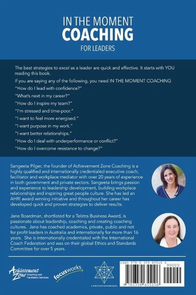 The best strategies to excel as a leader are quick and effective. It starts with YOU reading this book. If you are saying the following , you need IN THE MOMENT COACHING "How do I lead with confidence?" "What's next in my career?" "How do I inspire my team?" "I'm stressed and time-poor." "I want to feel more energised." "I want purpose in my work." "I want better relationships." "How do I deal with underperformance or conflict?" "How do I overcome resistance to change?"