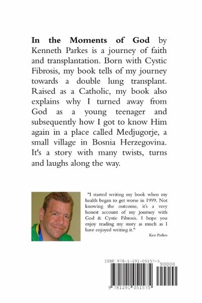 In the Moments of God by Kenneth Parkes is a journey of faith and transplantation. Born with Cystic Fibrosis, my book tells of my journey towards a double lung transplant. Raised as a Catholic, my book also explains why I turned away from God as a young teenager and subsequently how I got to know Him again in a place called Medjugorje, a small village in Bosnia Herzegovina. It's a story with many twists, turns and laughs along the way.