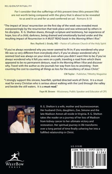 For I consider that the sufferings of this present time (this present life) are not worth being compared with the glory that is about to be revealed to us and in us and for us and conferred on us! Romans 8:18 The impact of Jesus¿ resurrection on the first day of the week was revealed most overpoweringly by the resurrection that took place and was witnessed by others in his disciples. R. G. Shelton shares, through scripture and testimony, her experience of hope, loss of a child, darkness, being drained and emotionally buried under and the resulting impact of Resurrection in A MUST READ book In the Morning When I Rise.¿ Rev. Rayford J. Grady, MD ¿ Pastor of Lutheran Church of the Holy Spirit If you've always wondered why you never seemed to fit in; if you wondered why your life was so very different from everybody else's; if you've always wondered why it seemed God was always on your mind, even when you didn't want Him to be; if you've always wondered why it felt you were on a path, traveling a road from which there appeared to be no permanent detours, read In the Morning When I Rise and discover why. Travel with the author as she journals her way from loss to anointing - from counting the cost to counting all things as loss for the excellency of Jesus Christ.¿ CM Taylor - Publisher, TIMothy Magazine I strongly support this sincere, heartfelt, spirited directed work of Christ. It is a must read for every Christian who is serious about walking with the Lord through the valley and beside the still waters. It is a must read.¿ Faye W. Brown - Missionary, Public Speaker and Educator of CPS