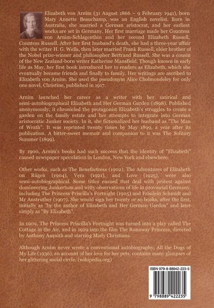 With a gentle hand, Elizabeth has created for us a cast of characters who are interesting, funny, loving and many faceted. The book starts out rather slowly and never ramps up to a blazing pace, but is delightful and made me laugh out loud many times. . (Sandy Thomlinson) About Elizabeth von Arnim: Elizabeth von Arnim (31 August 1866 - 9 February 1941), born Mary Annette Beauchamp, was an English novelist. Born in Australia, she married a German aristocrat, and her earliest works are set in Germany. Her first marriage made her Countess von Arnim-Schlagenthin and her second Elizabeth Russell, Countess Russell. After her first husband's death, she had a three-year affair with the writer H. G. Wells, then later married Frank Russell, elder brother of the Nobel prize-winner and philosopher Bertrand Russell. She was a cousin of the New Zealand-born writer Katherine Mansfield. Though known in early life as May, her first book introduced her to readers as Elizabeth, which she eventually became friends and finally to family. Her writings are ascribed to Elizabeth von Arnim. She used the pseudonym Alice Cholmondeley for only one novel, Christine, published in 1917. Arnim launched her career as a writer with her satirical and semi-autobiographical Elizabeth and Her German Garden (1898). Published anonymously, it chronicled the protagonist Elizabeth's struggles to create a garden on the family estate and her attempts to integrate into German aristocratic Junker society. In it, she fictionalized her husband as "The Man of Wrath". It was reprinted twenty times by May 1899, a year after its publication. A bitter-sweet memoir and companion to it was The Solitary Summer (1899). By 1900, Arnim's books had such success that the identity of "Elizabeth" caused newspaper speculation in London, New York and elsewhere. Other works, such as The Benefactress (1902), The Adventures of Elizabeth on Rügen (1904), Vera (1921), and Love (1925), were also semi-autobiographical. Some titles ensued that deal with protest against domineering Junkertum and witty observations of life in provincial Germany, including The Princess Priscilla's Fortnight (1905) and Fräulein Schmidt and Mr Anstruther (1907). She would sign her twenty or so books, after the first, initially as "by the author of Elizabeth and Her German Garden" and later simply as "By Elizabeth". In 1909, The Princess Priscilla's Fortnight was turned into a play called The Cottage in the Air, and in 1929 into the film The Runaway Princess, directed by Anthony Asquith and starring Mady Christians. Although Arnim never wrote a conventional autobiography, All the Dogs of My Life (1936), an account of her love for her pets, contains many glimpses of her glittering social circle. (wikipedia.org)