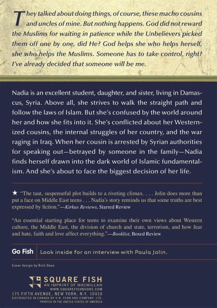 A 17-year-old Syrian girl's strengthening religious and political beliefs put her on the path toward Islamic fundamentalism. They talked about doing things, of course, these macho cousins and uncles of mine. But nothing happens. God did not reward the Muslims for waiting in patience while the Unbelievers picked them off one by one, did He? God helps she who helps herself, she who helps the Muslims. Someone has to take control, right? I've already decided that someone will be me. Nadia is an excellent student, daughter, and sister, living in Damascus, Syria. Above all, she strives to walk the straight path and follow the laws of Islam. But she's confused by the world around her and how she fits into it. She's conflicted about her Westernized cousins, the internal struggles of her country, and the war raging in Iraq. When her cousin is arrested by Syrian authorities for speaking out-betrayed by someone in the family-Nadia finds herself drawn into the dark world of Islamic fundamentalism. And she's about to face the biggest decision of her life.