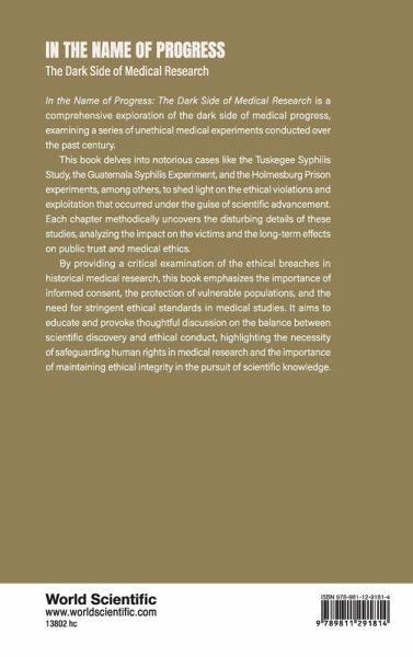 In the Name of Progress: The Dark Side of Medical Research is a comprehensive exploration of the dark side of medical progress, examining a series of unethical medical experiments conducted over the past century. This book delves into notorious cases like the Tuskegee Syphilis Study, the Guatemala Syphilis Experiment, and the Holmesburg Prison experiments, among others, to shed light on the ethical violations and exploitation that occurred under the guise of scientific advancement. Each chapter methodically uncovers the disturbing details of these studies, analyzing the impact on the victims and the long-term effects on public trust and medical ethics. By providing a critical examination of the ethical breaches in historical medical research, this book emphasizes the importance of informed consent, the protection of vulnerable populations, and the need for stringent ethical standards in medical studies. It aims to educate and provoke thoughtful discussion on the balance between scientific discovery and ethical conduct, highlighting the necessity of safeguarding human rights in medical research and the importance of maintaining ethical integrity in the pursuit of scientific knowledge.