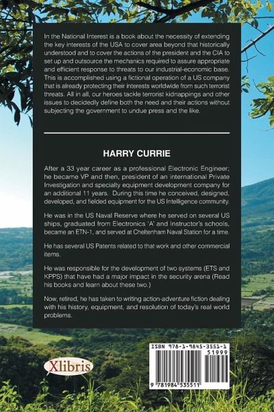 In the National Interest is a book about the necessity of extending the key interests of the USA to cover area beyond that historically understood and to cover the actions of the president and the CIA to set up and outsource the mechanics required to assure appropriate and efficient response to threats to our industrial-economic base. This is accomplished using a fictional operation of a US company that is already protecting their interests worldwide from such terrorist threats. All in all, our heroes tackle terrorist kidnappings and other issues to decidedly define both the need and their actions without subjecting the government to undue press and the like.