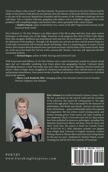 Enter into In the Near Distance in the desert where the sounds of a ranch fill the quiet of the day and the night culminates in "a jubilation of stars." Find yourself in geographical locales as well as invisible worlds. Make way for truck drivers, states of being, alcoholism, as well as joy. Stay for a while in Appalachia where voices of family and friends from the long-ago, speak in rich, timbered voices. Stay in grief as long as you need to, mourning those who have passed on, those taken by the pandemic. As sorrow finds its level, transcend with the love of dogs, in praise of children who don't listen, and tree-climbing at 67. At the final stop, humble acceptance leaves space to continue discovering and unraveling the unknown.