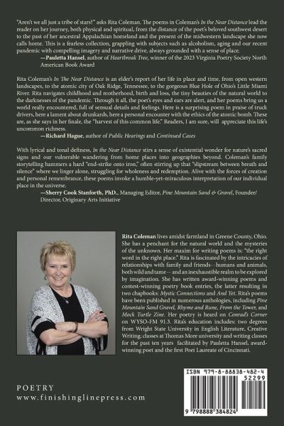 Enter into In the Near Distance in the desert where the sounds of a ranch fill the quiet of the day and the night culminates in "a jubilation of stars." Find yourself in geographical locales as well as invisible worlds. Make way for truck drivers, states of being, alcoholism, as well as joy. Stay for a while in Appalachia where voices of family and friends from the long-ago, speak in rich, timbered voices. Stay in grief as long as you need to, mourning those who have passed on, those taken by the pandemic. As sorrow finds its level, transcend with the love of dogs, in praise of children who don't listen, and tree-climbing at 67. At the final stop, humble acceptance leaves space to continue discovering and unraveling the unknown.