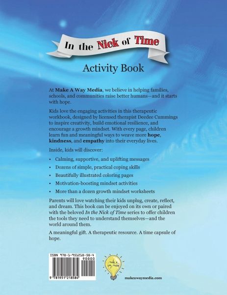 At Make A Way Media, we believe in helping families, schools, and communities raise better humans-and it starts with hope. Kids love the engaging activities in this therapeutic workbook, designed by licensed therapist Deedee Cummings to inspire creativity, build emotional resilience, and encourage a growth mindset. With every page, children learn fun and meaningful ways to weave more hope, kindness, and empathy into their everyday lives. Inside, kids will discover: Calming, supportive, and uplifting messages Dozens of simple, practical coping skills Beautifully illustrated coloring pages Motivation-boosting mindset activities More than a dozen growth mindset worksheets Parents will love watching their kids unplug, create, reflect, and dream. This book can be enjoyed on its own or paired with the beloved In the Nick of Time series to offer children the tools they need to understand themselves-and the world around them. A meaningful gift. A therapeutic resource. A time capsule of hope.
