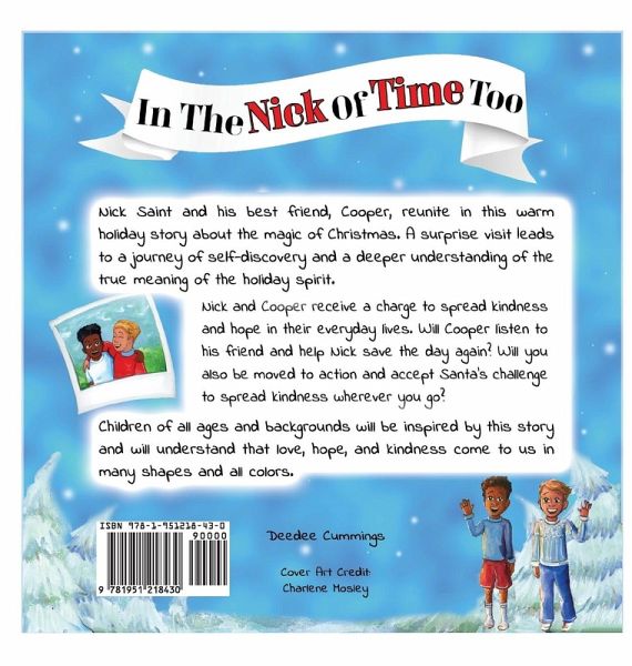 Nick Saint and his best friend, Cooper, reunite in this warm holiday story about the magic of Christmas. A surprise visit leads to a journey of self-discovery and a deeper understanding of the true meaning of the holiday spirit. Nick and Cooper receive a charge to spread kindness and hope in their everyday lives. Will Cooper listen to his friend and help Nick save the day again? Will you also be moved to action and accept Santa's challenge to spread kindness wherever you go? Children of all ages and backgrounds will be inspired by this story and will understand that love, hope and kindness come to us in many shapes and all colors.