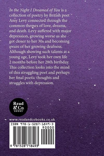 "In the Night I Dreamed of You" is a collection of poetry by British poet Amy Levy connected through the common themes of love, dreams, and death. Levy suffered with major depression, growing worse as she got closer to her 30s and becoming aware of her growing deafness. Although showing such talents at a young age, Levy took her own life 2 months before her 28th birthday. This collection looks into the mind of this struggling poet and perhaps her final poetic thoughts and struggles with depression. Contents include: "New Love, New Life", "Impotens", "Youth and Love", "The Dream", "On the Threshold", "The Birch-Tree at Loschwitz", "In the Night", "Borderland", "At Dawn", "Last Words", "June", "Reminiscence", "The Sequel to 'A Reminiscence'", "In the Mile End Road", "Contradictions", "Twilight", and "In September". Amy Judith Levy (1861-1889) was a British poet, novelist, and essayist. She was notably the first Jewish woman to study at Cambridge university, and she became well-known for her feminist positions as well as her romantic relationships with both male and female political and literature figures. Other works by this author include: "Xantippe and Other Verse" (1881), "The Romance of a Shop" (1888), and "Miss Meredith" (1889). As part of our poetry imprint "Ragged Hand" Read & Co. is proudly publishing this brand new collection of classic poetry complete with an introductory biography of the author by Richard Garnett.