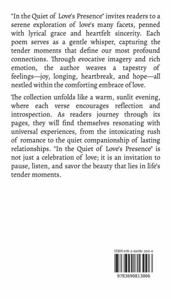 "In the Quiet of Love's Presence" invites readers to a serene exploration of love's many facets, penned with lyrical grace and heartfelt sincerity. Each poem serves as a gentle whisper, capturing the tender moments that define our most profound connections. Through evocative imagery and rich emotion, the author weaves a tapestry of feelings-joy, longing, heartbreak, and hope-all nestled within the comforting embrace of love. The collection unfolds like a warm, sunlit evening, where each verse encourages reflection and introspection. As readers journey through its pages, they will find themselves resonating with universal experiences, from the intoxicating rush of romance to the quiet companionship of lasting relationships. "In the Quiet of Love's Presence" is not just a celebration of love; it is an invitation to pause, listen, and savor the beauty that lies in life's tender moments.
