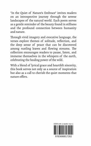 "In the Quiet of Nature's Embrace" invites readers on an introspective journey through the serene landscapes of the natural world. Each poem serves as a gentle reminder of the beauty found in stillness and the profound connection between humanity and nature. Through vivid imagery and evocative language, the verses explore themes of solitude, reflection, and the deep sense of peace that can be discovered among rustling leaves and flowing streams. The collection encourages readers to pause, listen, and immerse themselves in the whispers of the earth, celebrating the healing power of the wild. With a blend of lyrical grace and heartfelt sincerity, this book serves not only as a source of inspiration but also as a call to cherish the quiet moments that nature offers.