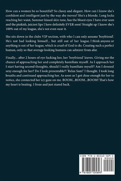 How can a women be so beautiful? So classy and elegant. How can I know she's confident and intelligent just by the way she moves? She's a blonde. Long locks reaching her waist, Summer kissed skin tone, has the bluest eyes I have ever seen and the pinkish, juiciest lips I have definitely EVER seen! Straight up I know she's 100% out of my league, she's not even near it. She sits down in the clubs VIP section, with who I can only assume 'boyfriend'. He's not bad looking himself... but still out of her league. I think anyone or anything is out of her league, which is cruel of God to do. Creating such a perfect human, only so that average looking humans can admirer from afar. Finally... after 2 hours of eye fucking her, her 'boyfriend' leaves. Giving me the chance of approaching her and completely humiliate myself. As I approach her I start having second thoughts, should I really humiliate myself? Am I dressed sexy enough for her? Do I look presentable?! 'Relax Sam!' I thought. I took long breaths and continued approaching her. As soon as I got close enough for her to notice, she connected her icy gaze on me. BOOM...BOOM...BOOM! That's how my heart is beating. I froze and just stared back.