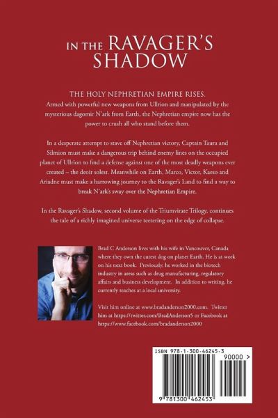 The Holy Nephretian Empire rises. Armed with powerful new weapons from Ullrion and manipulated by the mysterious dagomir N'ark from Earth, the Nephretian empire now has the power to crush all who stand before them. In a desperate attempt to stave off Nephretian victory, Captain Taura and Silmion must make a dangerous trip behind enemy lines on the occupied planet of Ullrion to find a defense against one of the most deadly weapons ever created the deoir solest. Meanwhile on Earth, Marco, Victor, Kaeso and Ariadne must make a harrowing journey to the Ravager's Land to find a way to break N'ark's sway over the Nephretian Empire. In the Ravager's Shadow, second volume of the Triumvirate Trilogy, continues the tale of a richly imagined universe teetering on the edge of collapse.