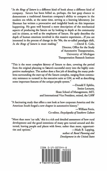In this compelling, readable narrative, Joe Sherman explores virtually every aspect of the Saturn project, America's biggest and most publicized industrial success of the last decade. Here is the whole story - Saturn's mysterious beginnings inside General Motors in 1982; the site hunt that involved 38 states and ended in Spring Hill, Tennessee; the plant's construction and the transfer of 5,000 UAW members to a historic Southern backwater; and finally the small car's triumph in the marketplace. Telling the story through the standpoint of dozens of characters, from local farmers, to inspired assembly line workers, to 'car smarts and gut feel' engineers, Sherman brings to life a very American story of renewal and growth, of great hope and soured expectations, of greed and lost opportunities. And he reveals that if the USA wants to produce high quality products that the world will want to buy, it must begin to adopt methods similar to those used in making the Saturn car.
