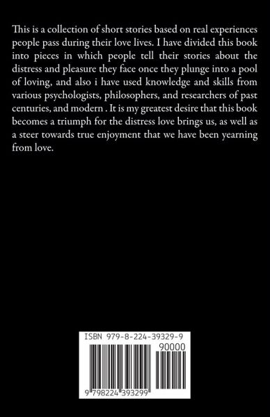 This is a collection of short stories based on real experiences people pass during their love lives. I have divided this book into pieces in which people tell their stories about the distress and pleasure they face once they plunge into a pool of loving, and also i have used knowledge and skills from various psychologists, philosophers, and researchers of past centuries, and modern . It is my greatest desire that this book becomes a triumph for the distress love brings us, as well as a steer towards true enjoyment that we have been yearning from love.