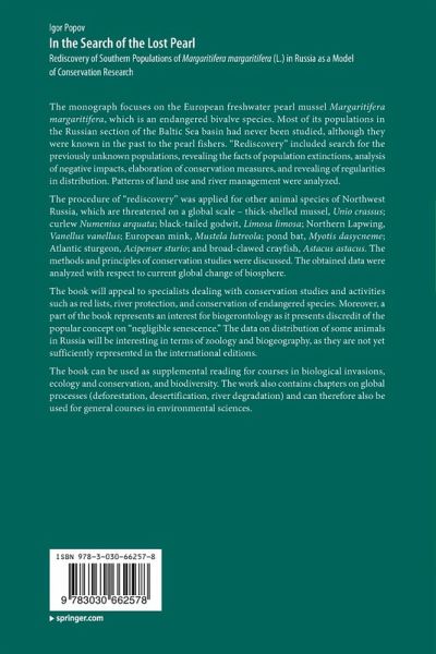 The monograph focuses on the European freshwater pearl mussel Margaritifera margaritifera, which is an endangered bivalve species. Most of its populations in the Russian section of the Baltic Sea basin had never been studied, although they were known in the past to the pearl fishers. "Rediscovery" included search for the previously unknown populations, revealing the facts of population extinctions, analysis of negative impacts, elaboration of conservation measures, and revealing of regularities in distribution. Patterns of land use and river management were analyzed.