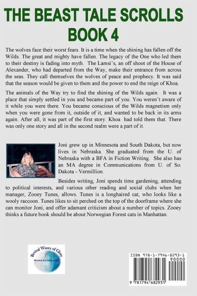 The wolves face their worst fears. It is a time when the shining has fallen off the Wilds. The great and mighty have fallen. The legacy of the One who led them to their destiny is fading into myth. The Lamsi's, an off shoot of the House of Alexander, who had departed from the Way, make their entrance from across the seas. They call themselves the wolves of peace and prophecy. It was said that the season would be given to them and the power to end the reign of Khoa. The animals of the Way try to find the shining of the Wilds again. It was a place that simply settled in you and became part of you. You weren't aware of it while you were there. You became conscious of the Wilds magnetism only when you were gone from it, outside of it, and wanted to be back in its arms again. After all, it was part of the first story. Khoa had told them that. There was only one story and all in the second realm were a part of it.