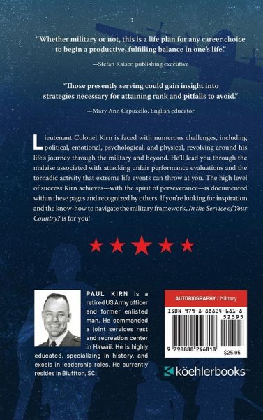 Lieutenant Colonel Kirn is faced with numerous challenges, including political, emotional, psychological, and physical, revolving around his life's journey through the military and beyond. He'll lead you through the malaise associated with attacking unfair performance evaluations and the tornadic activity that extreme life events can throw at you. The high level of success Kirn achieves-with the spirit of perseverance-is documented within these pages and recognized by others. If you're looking for inspiration and the know-how to navigate the military framework, In the Service of Your Country? is for you!