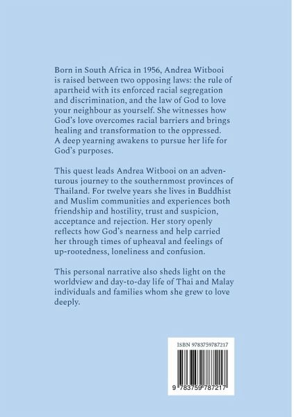 Born in South Africa in 1956, Andrea Witbooi grows up between two opposing laws: the rule of apartheid with its enforced racial segregation and discrimination, and the law of God to love your neighbour as yourself. Through the life and ministry of her father, she witnesses how the love of Jesus overcomes hatred and brings hope, healing and transformation to youngsters living in perilous conditions in Johannesburg's townships. This awakens a deep yearning to also invest her life for God's purposes. But where and how? Following God's prompting, her adventurous journey leads her to the Kingdom of Thailand. She studies the Thai language and grapples with everyday life ruled by unfamiliar cultural norms embedded in a Buddhist worldview. Then another move takes her to the Muslim dominated South of Thailand. Together with her growing family, she makes her home in provincial towns and villages, where the pillars of Islam determine the religious, behavioural and dietary rules of the local communities. As a Christian foreigner, she experiences both friendship and hostility, trust and suspicion, acceptance and rejection. This biographical narrative reflects how God's comforting nearness, help and protection carried Andrea Witbooi through times of upheaval and feelings of up-rootedness, loneliness and confusion. Her story also opens a window into the daily lives and struggles of Thai and Malay individuals and families whom she grew to love deeply.