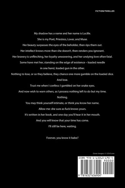 My shadow has a name and her name is Lucille. She is my Poet, Priestess, Lover, and Muse. Her beauty surpasses the eyes of the beholder, then rips them out. Her intellect knows more than she doesn't, then renders you ignorant. Her bravery is unflinching, her loyalty unwavering, and her undying love often fatal. Some have met her, standing on the edge of existence - loaded needle in one hand, loaded gun in the other. Nothing to lose, or so they believe, they chance one more gamble on the loaded dice. And lose. Trust me when I confess: I gambled on her snake eyes. And now wish to warn others, as I possess nothing left to do but my time. Nothing. You may think yourself intimate, or think you know her name. Allow me: she surely knows yours. It's written in her book, and one day you'll hear it in her mouth. And you'll know that your time has come. I'll still be here, waiting. Forever.