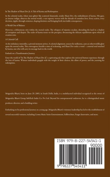 In The Shadow of Shani Dev Ji: A Tale of Karma and Redemption In the celestial realm, where stars glitter like scattered diamonds, resides Shani Dev, the embodiment of karma. His gaze, an intense indigo, observes the mortal world, a vast tapestry woven with the threads of countless lives. Every action, every decision, ripples through existence, shaping destinies and bringing forth inevitable consequences. A World Out of Balance However, a disharmony stirs within the mortal realm. The whispers of injustice escalate, shrouding the land in a shadow of corruption and despair. The scales of karma teeter on the precipice, threatening the delicate equilibrium upon which all creation rests. A Celestial Call As the imbalance intensifies, a pivotal moment arrives. A celestial alignment, unseen for millennia, casts an otherworldly glow upon the mortal realm. This convergence heralds a time of reckoning, and Shani Dev seeks a vessel - a mortal soul touched by karma, one who will carry its message back to the world. Embark on a Transformative Journey Enter the world of "In The Shadow of Shani Dev Ji," a captivating tale that explores the universal human experience through the lens of karma. Witness individuals grapple with the weight of their choices, the allure of power, and the yearning for redemption. Unveiling the Mysteries of Karma Delve into the intricacies of karma, a force that not only dictates consequences but also offers opportunities for growth and enlightenment. Discover how acts of compassion, courageous decisions, and unwavering faith in justice can illuminate the path towards a more balanced existence. A Timeless Tale "In The Shadow of Shani Dev Ji" transcends the boundaries of culture and belief. It's a story that resonates with anyone who has ever faced the consequences of their actions, strived for redemption, and ultimately, sought to find liberation from the shackles of the past.
