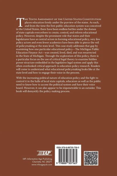 The Tenth Amendment of the United States Constitution places education firmly under the purview of the states. As such, and from the time the first public education system was conceived in the United States, there have been endless battles under the domes of state capitals everywhere to create, control, and reform educational policy. However, despite the prominent role that states and their legislatures have as central actors in forming educational policy, very few policy actors and even fewer academics have been able to pierce the veil of policymaking at the state level. This case study addresses that gap by examining how one particular educational policy - The Michigan Public Education Finance Act - was created, lived, died, and was resurrected in the State of Michigan. Through the exploration of this policy, there is a particular focus on the use of critical legal theory to examine hidden power structure embedded in the legislative legal system and apply this often-overlooked critical approach to education policy research. Readers will come to understand what educational policymaking looks like at the state level and how to engage their voice in the process. With the increasing political nature of education policy and the fight to control it in the halls of local state capitals, educators as well as the public need to know how to access the political system and have their voice heard. However, it can also appear to be impenetrable to an outsider. This book will demystify the policy making process.